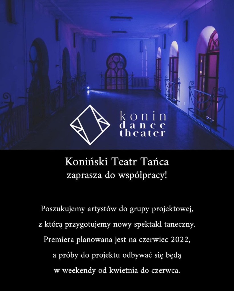 Na spektakl zapraszają: Koniński Teatr Tańca Epicentrum Kultury Młodzieżowy Dom Kultury w Koninie Konin. Tu płynie energia Miasto Koło proARTI Stowarzyszenie Malinowa Mamba